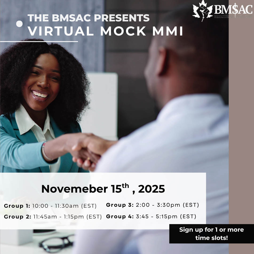 Interview season can feel overwhelming — but preparation makes all the difference. The BMSAC invites Black students and students from other equity-seeking communities to join us for our Mock MMI Night, a supportive and interactive preparation event designed to help you excel in your medical school interviews.